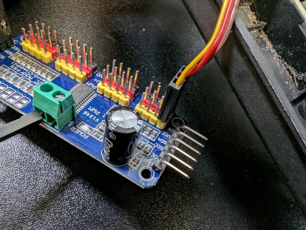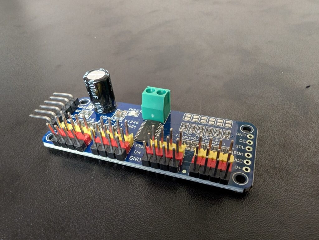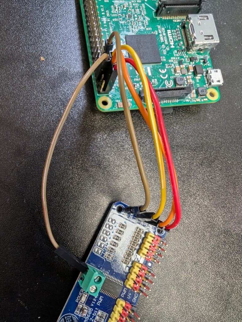 First we have to connect the PCA9685 to the Raspberry Pi. The PCA9685 uses I2C, so you can connect the SCL pin on the board to the SCL pin on the Raspberry Pi (Pin 5) and the SDA pin on the board to the SDA pin on the Raspberry Pi (Pin 3). Connect ground to ground (Pin 9 or 6), and VCC to 3.3V power on the Raspberry Pi (Pin 1).